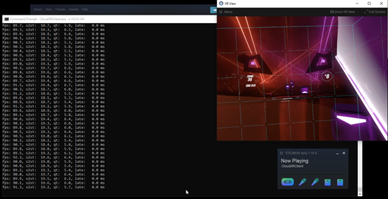 In order to understand the impact of the network bandwidth on CloudXR, a further test was also carried out where the network was forced to operate below the recommended minimum level which is 50Mbps per second to 30Mbps and 10Mbps. The result is that there were lags in the game’s video and audio stream of anywhere between 1 and 3 seconds. This happened very consistently and made Beat Saber quite unplayable. The recommended connection speed for a Cloud-XR session is 60Mbps, and it is also recommended to use a single dedicated WiFi access point. 5G does not suffer the same one-to-one access point recommendation, but it is important to consider network congestion in any remote streaming design.