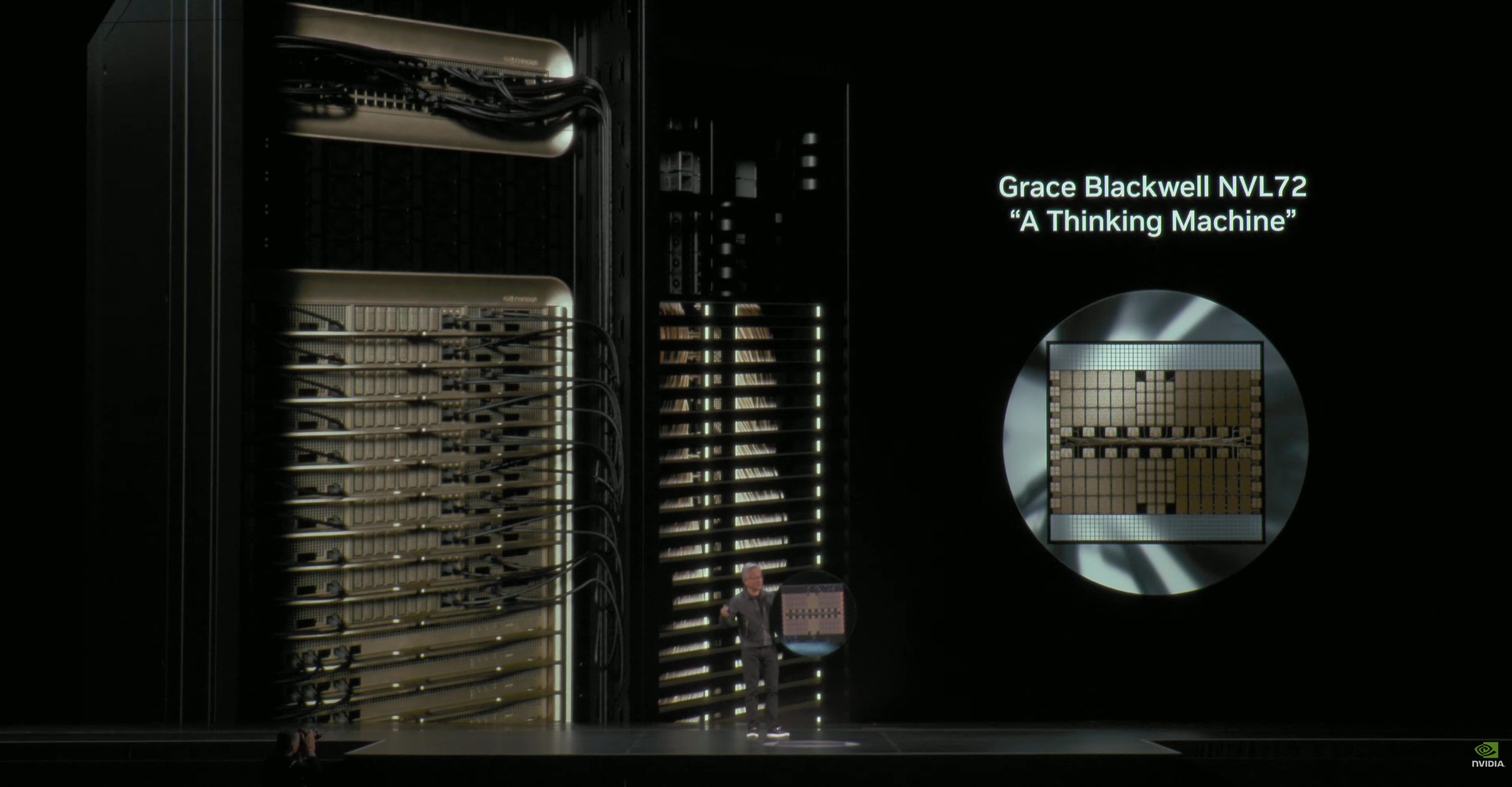 Scale was the keynote’s metronome. Huang framed a new unit of compute not as the server but the rack: enter the NVL72 “Thinking Machine”, a rack-scale system that unifies 72 Blackwell GPUs and an array of Grace CPUs into a single, liquid-cooled NVLink domain. Huang touted step-change performance, Grace/Blackwell pairings that deliver substantially faster inference and lower cost per token than prior generations, and positioned the NVL72 as the architectural “atom” of the AI factory.