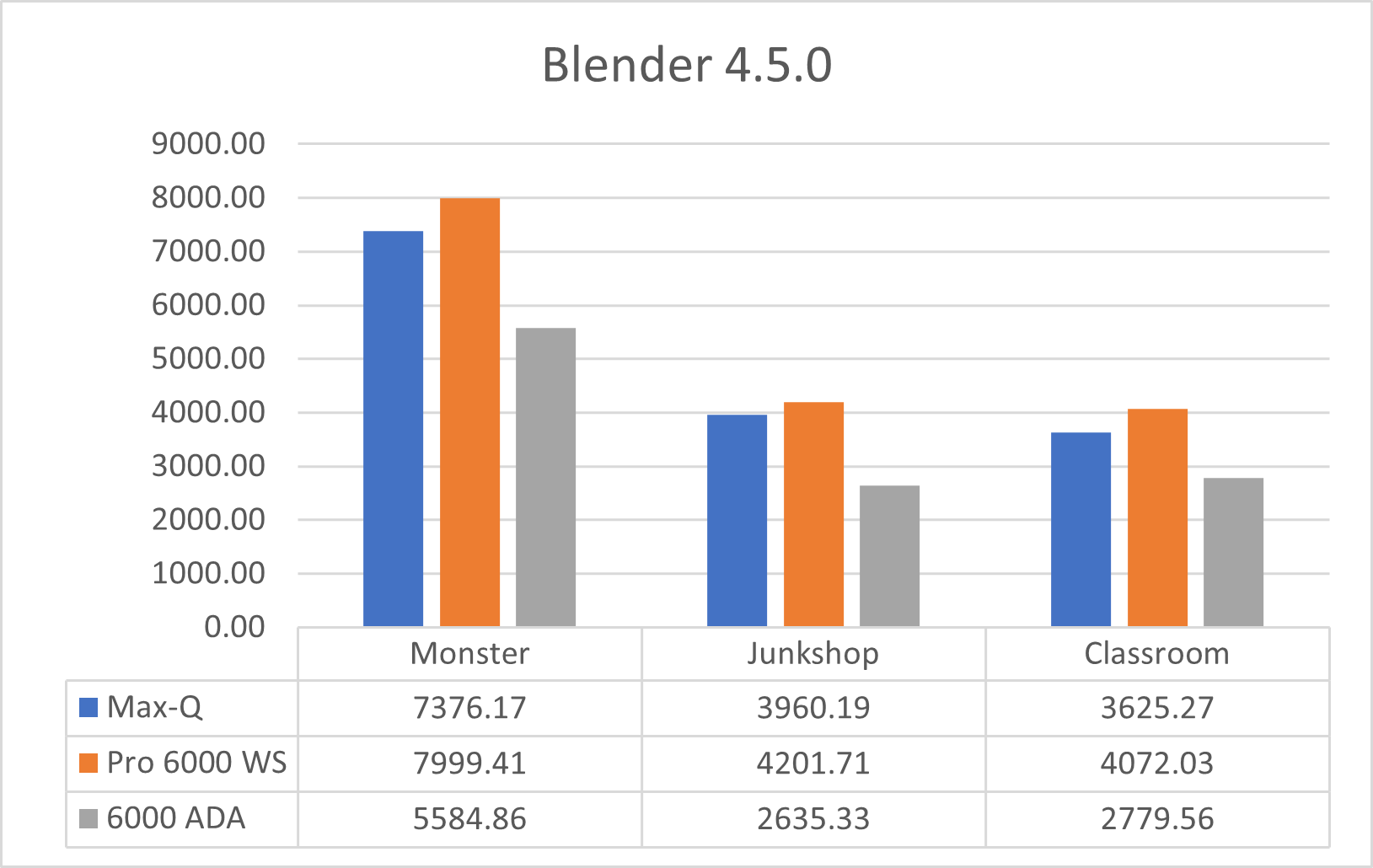 The RTX PRO 6000 Blackwell Max-Q does beat the previous NVIDIA RTX 6000 Ada Generation across all three tests. With the Monster scene, the Max-Q had ~32% better performance overall, the Junkshop scene it saw a performance jump of ~50% and the Classroom scene shows improvement of ~30% overall.